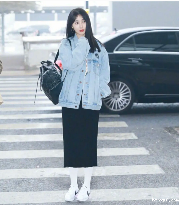 Angelababy杨颖的机场私服,牛仔外套搭配长款T恤,细长腿十分优越,减龄又时尚。